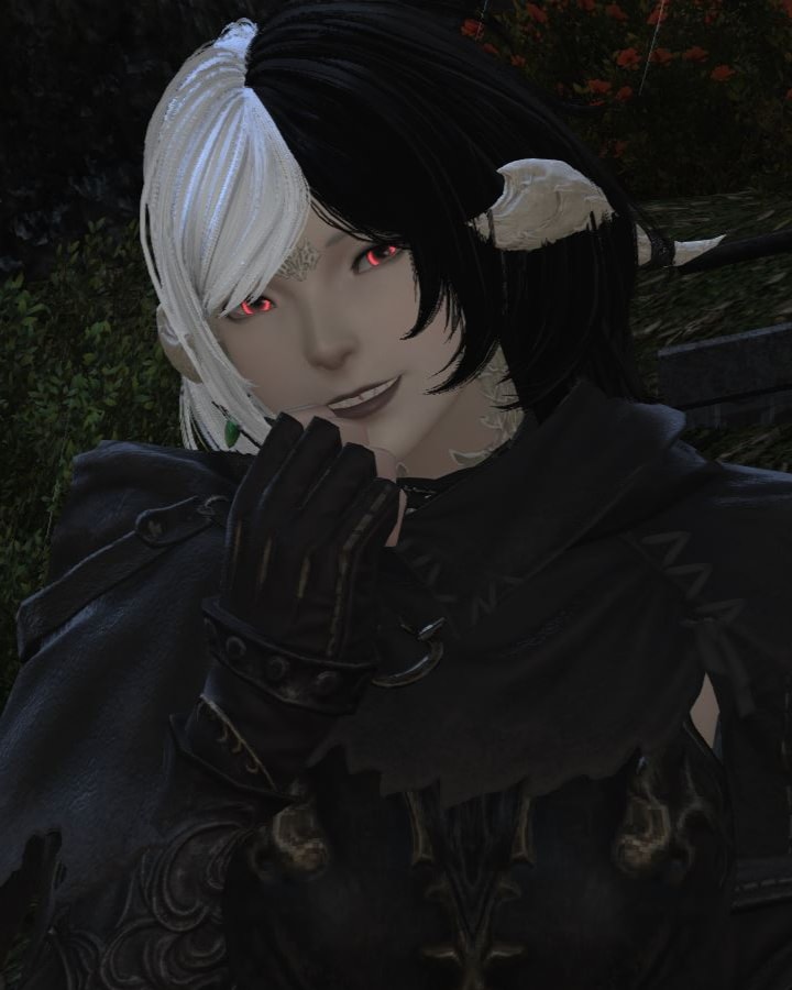 Sary holds a dangerous air to her, with pale skin and an otherworldly darkening of half her head of hair it’s quite obvious something dark had twisted her into who she is now. The most telling part about her experience can be seen in her face. Devilish crimson eyes glow with a barely held back hunger and when she opens her mouth, sharp, pointed teeth can be seen ringing her mouth like that of a predator.Despite her monstrous features she does her best to put forth a welcoming approach just pay no mind to that wicked glow in her eyes and the dangerous point of her teeth.