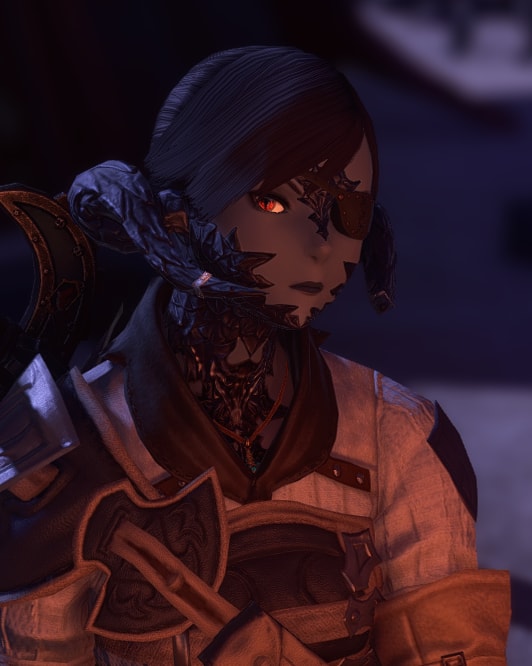 Slightly taller than most female Au Ra and possessing the lean, well-built body of a hardened veteran, Captain Baatarsaikhan Kha is the kind of soldier you can pick out in a crowd of civilians. Countless scars and burns cover her grey-blue skin, and she’s rarely seen in public without her short, purple hair tied into a no-nonsense bun. Those who match her gaze will find one red eye staring back - her ruined left eye almost always covered by either a simple eyepatch or a scrap of cloth - accompanied by a frown that has become her default expression.