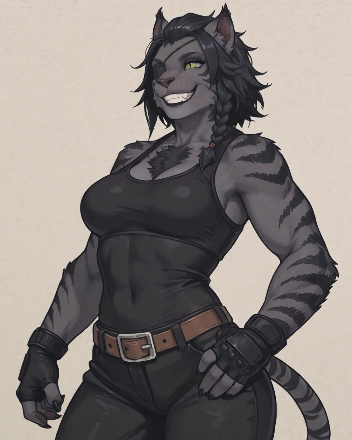 Gray fur with an obsidian mane and markings. Sharp claws. Emerald eye.