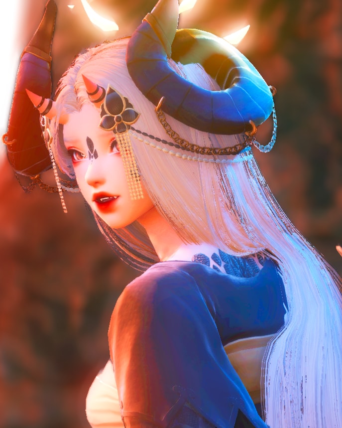 Upon initial inspection of the Xaela woman, it is evident that her pale flesh is covered with a series of ebony scales, growing in frequency and intensity near her legs and arms. Her horns are medium-sized and plated with scales, a headpiece symbolizing nhaama adorned atop her head alongside the scaly fixtures. Her hair is a blonde tone, tinted with a peach hue that compliments her amber irises.in the daytime, Saranai is seen adorned in fabrics from head to toe, shielding most of her skin from the harsh rays of Azim's sun whenever she is forced to leave her chambers.