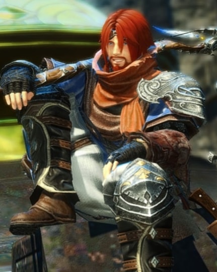 A tall Hyur Midlander of broader stock and frame, with sun-kissed skin and ruddy hair. His locks drape heavy yet loose about his head, framing his face while neatly braided low at the back—much like a long tail.