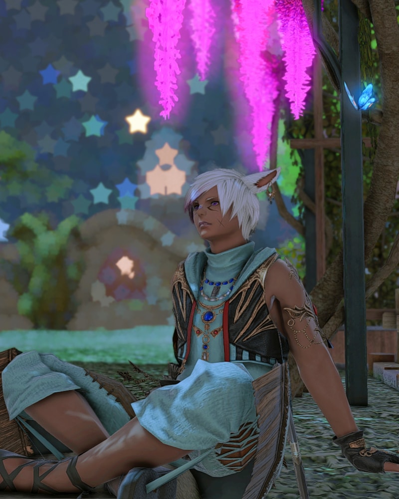 Currently, Naoh'li splits his time between his rooms at the Students of Baldesion Annex in Old Sharlayan, temporary quarters in Xak Tural's Solution 9, and the guild house of his free company in Ishgard. He is known to be an active performer in a dance troupe, and occasionally takes housing design commissions. He frequently falls in love with Viera boys, to the dismay of his friends who have to listen to him bemoan his broken heart into his cups, and with a little luck, might be caught in the midst of Eorzea's nightlife now and then.